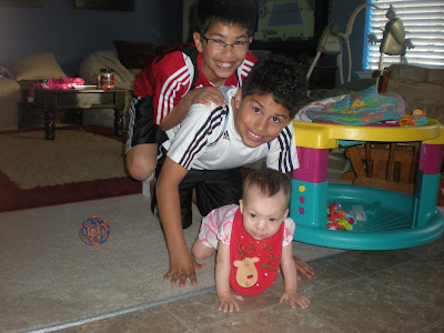 The following week Mia and I were suppose to fly out of town to Utah to visit grandma and grandpa and other friends and family. Mia'd come down with a double ear infection the Thursday before. She had been on an antibiotic since then and was doing better, but on Tuesday morning - the day we were suppose to fly out - she woke up sad and wouldn't eat and had a crusty nose. I was worried that we might have to go into the doctor and switch medicines, and since she was still clingy and sad and not eating as it got close to head to the air port time, we decided to postpone the trip. Thank goodness we had tickets through Southwest where you can reschedule without loosing your money or getting charged any kind of fee. It ended up working out better than we could have expected. Mia started feeling better by that evening thankfully! It also worked out great because my parents ended up having to make an emergency trip to So. California to deal with some family issues and it made it so that Mia and I were able to be in town when we got a visit from part of Zeus's family that I'd never met before - Ramon and Rebeca and their family. Zeus's cousins from Mexico (Rebeca) happened to marry one of his team mates (Ramon) that Zeus had played college ball with back in the day. The funny thing is that they didn't realize they were cousins until after Rebeca and Ramon were already together. Rebeca's mom came along as well as their darling boys Rodrigo and Cato. We had SUCH a good time with them! Unfortunately Zeus was already back at work, but luckily Mia and I were able to spend time with them. Mia totally adored Rebeca and her mom and equally adored and was adored by Rodrigo and Cato. The boys were so cute with Mia and seemed to be amazed by our crawling, clapping, happy little girl.